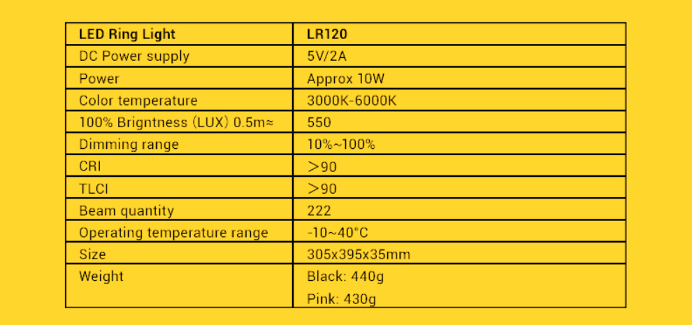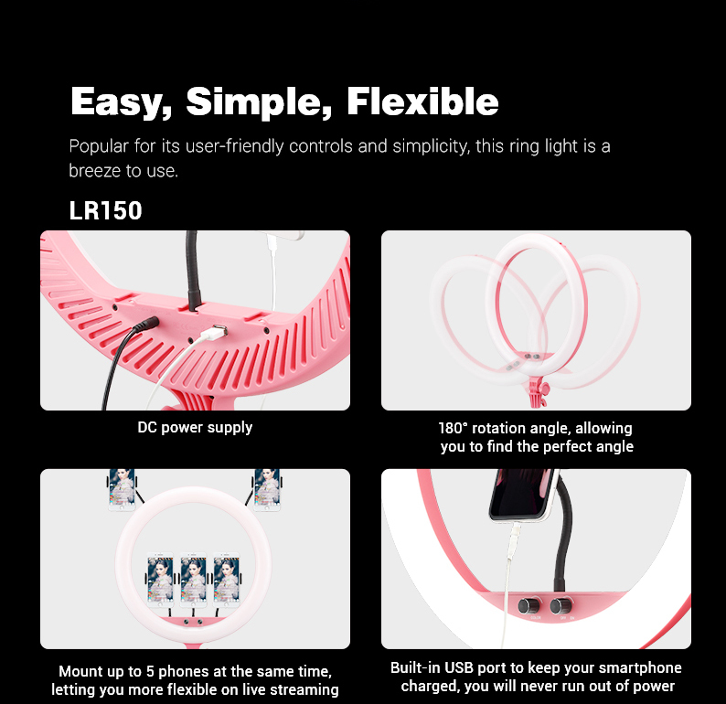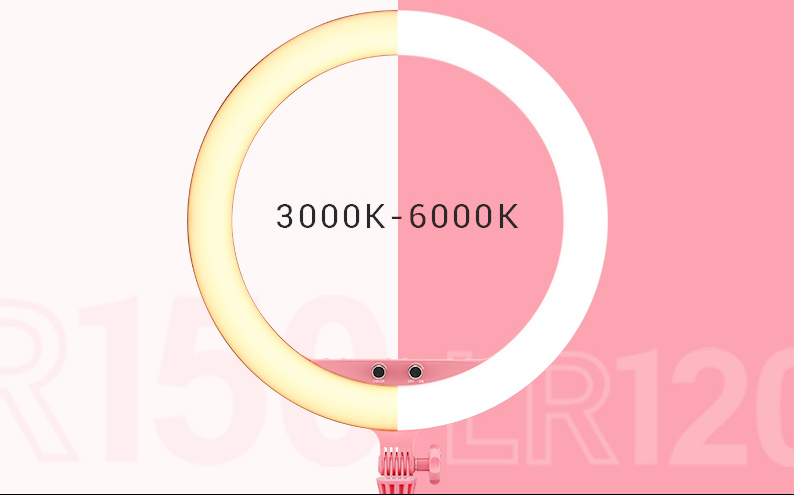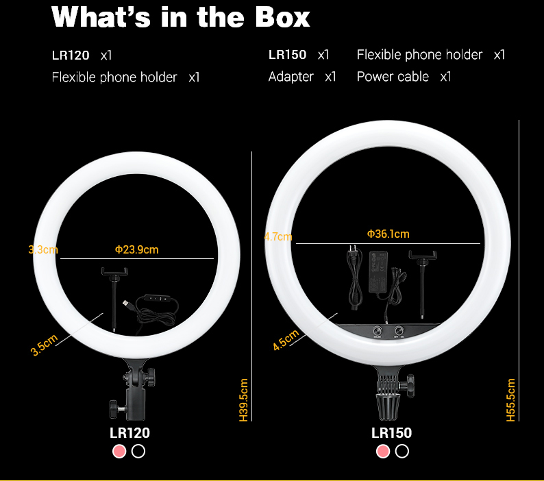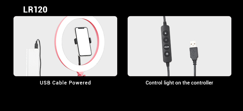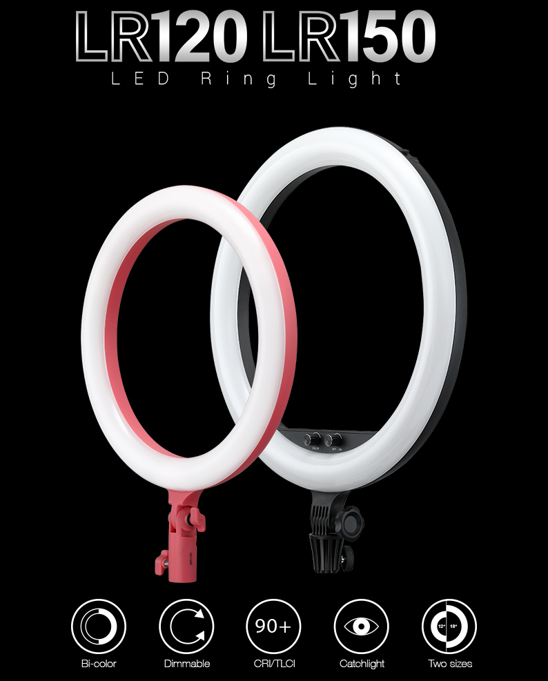 LED 環形燈 LR120 有2種顏色,黑色和粉紅色,適用於採訪佈光、靜物拍攝、視頻拍攝以及美妝造型和眼神光等。